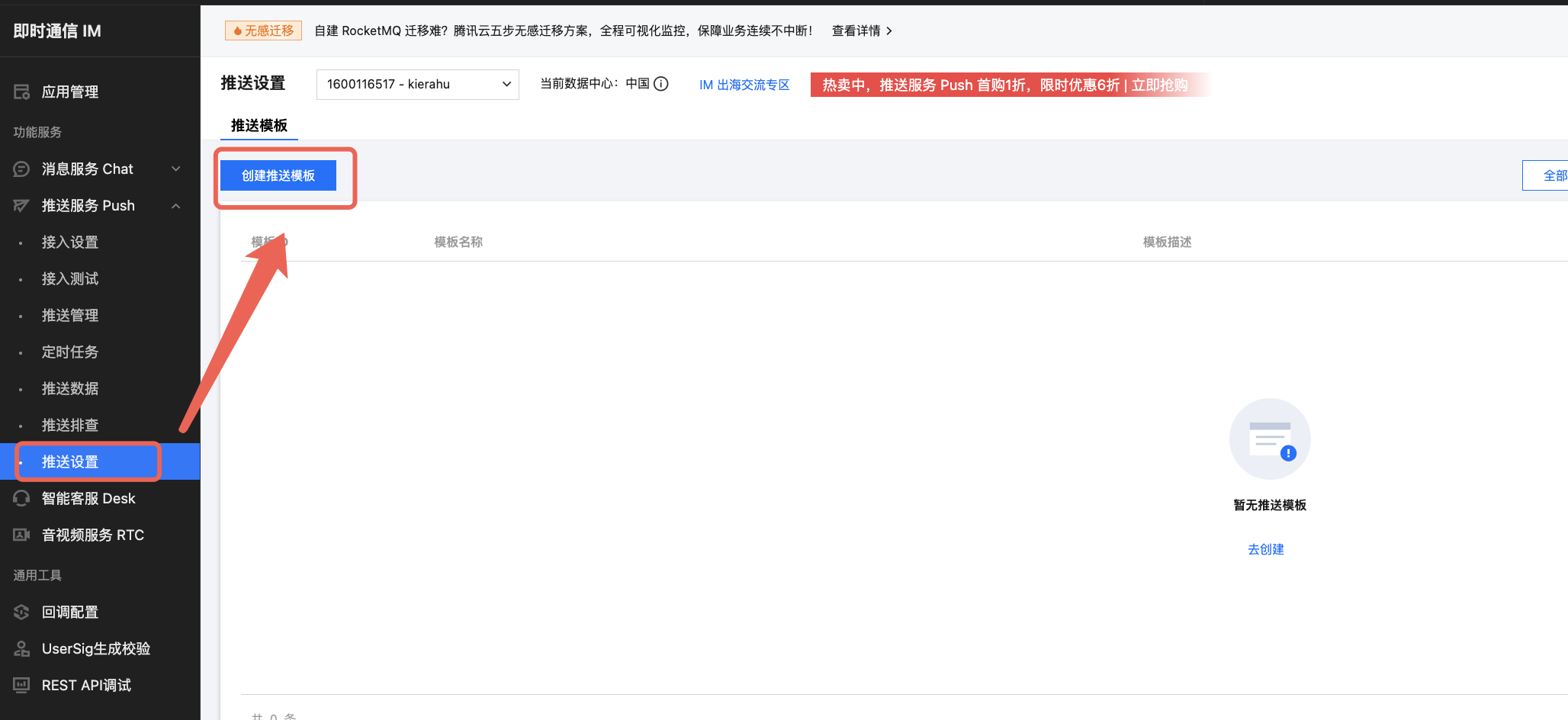 1. 前往 控制台 > 推送服务Push > 推送设置,点击创建推送模板。