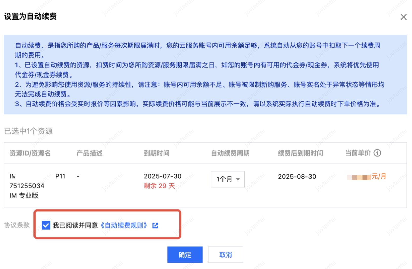 3. 在弹出的自动续费窗口,确认产品信息,确认无误后勾选同意《自动续费规则》,单击“确认”按钮。