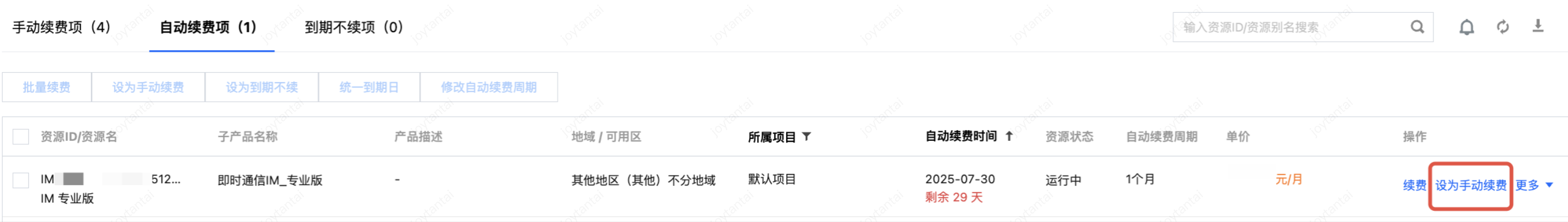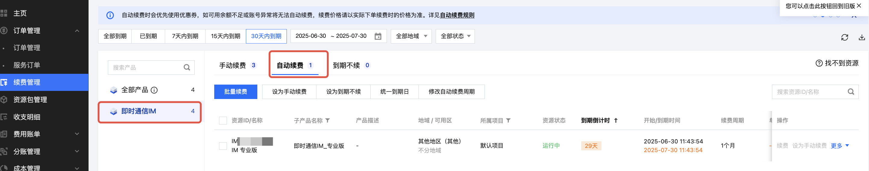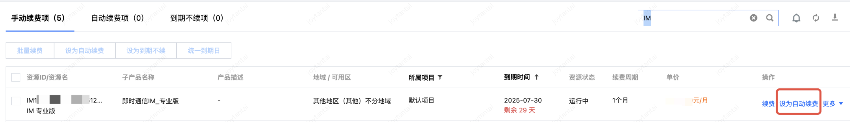 IM,找到对应资源,点击设为自动续费。