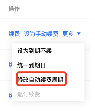 1. 点击更多 > 修改自动续期周期,在弹出的窗口确认产品信息。
