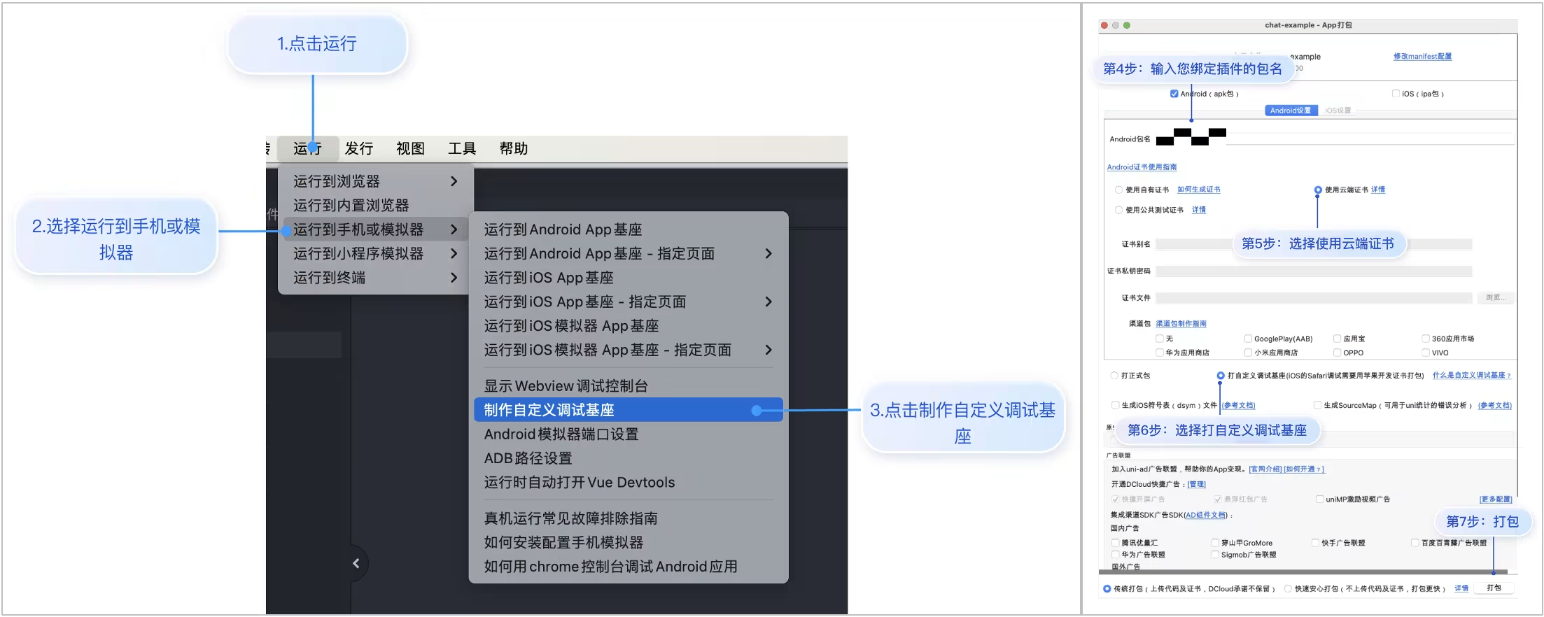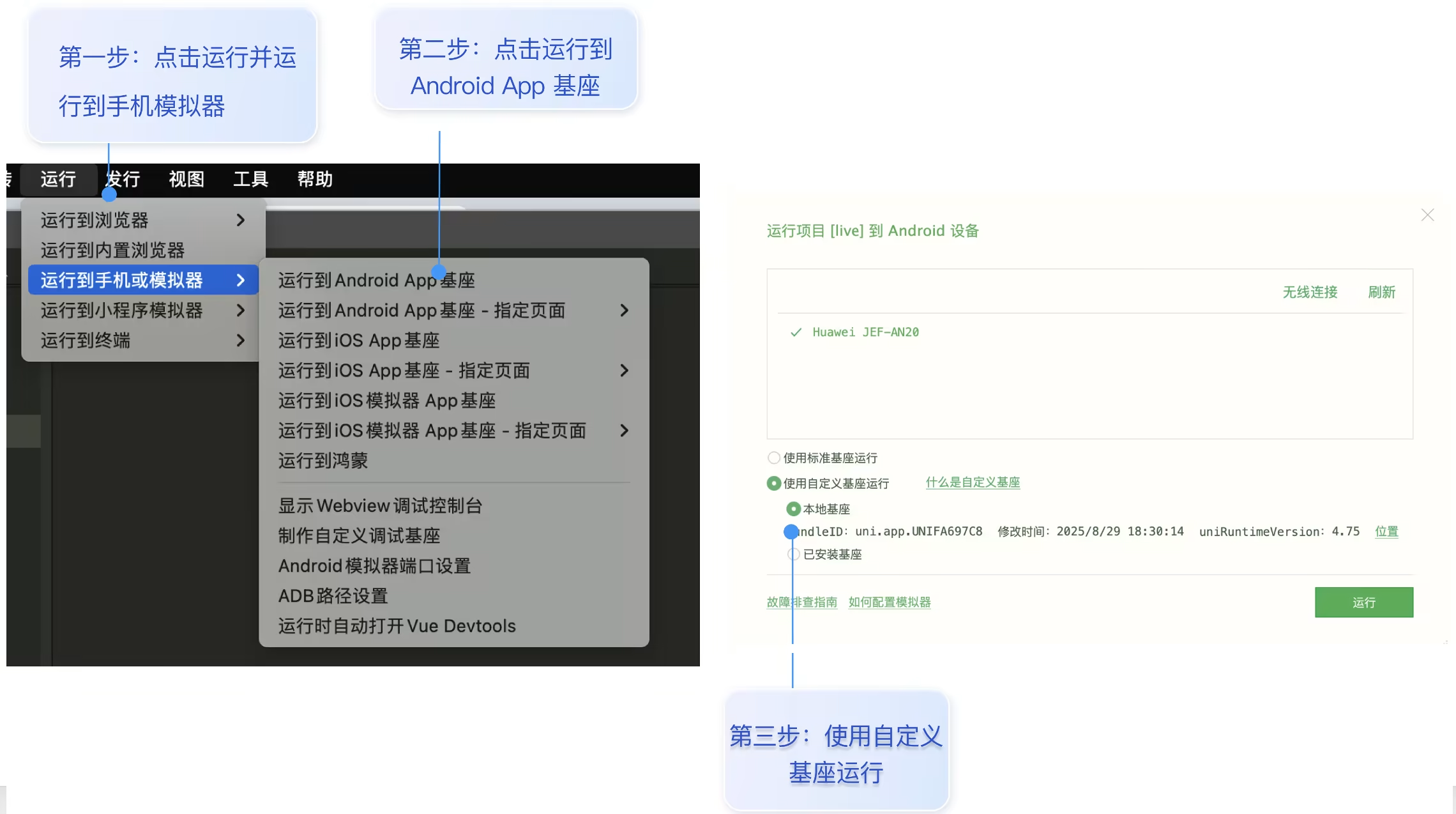 解决步骤: 请严格按照文档“运行和测试-步骤2”操作,在 HBuilderX 中点击 运行 > 运行到手机或模拟器 > 制作自定义调试基座。制作完成后,运行时请务必选择运行到 Android/iOS 基座,并勾选“使用自定义基座”。
