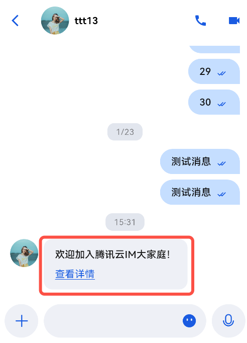 // 创建 MessageInputStore 对象MessageInputStore _messageInputStore = MessageInputStore.create(conversationID: widget.conversationID);// 构造自定义消息final messageInfo = MessageInfo();messageInfo.messageType = MessageType.custom;MessageBody messageBody = MessageBody();messageBody.customMessage = CustomMessageInfo(data: '{"businessID":"text_link","link":"https://cloud.tencent.com/document/product/269/3794","text":"欢迎加入腾讯云IM大家庭!"}',);messageInfo.messageBody = messageBody;// 发送消息await _messageInputStore.sendMessage(message: messageInfo);