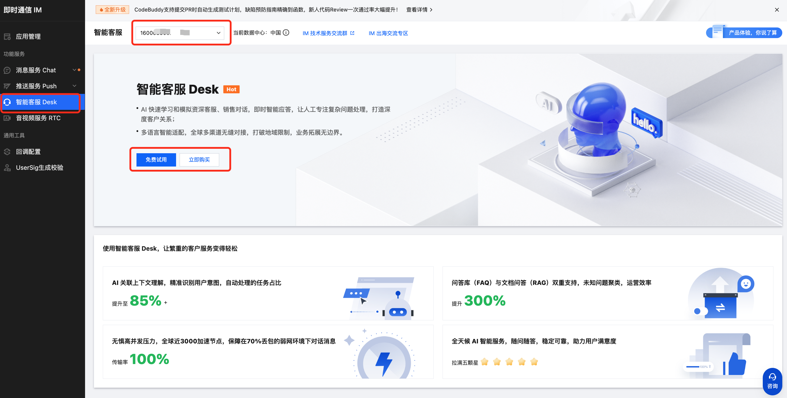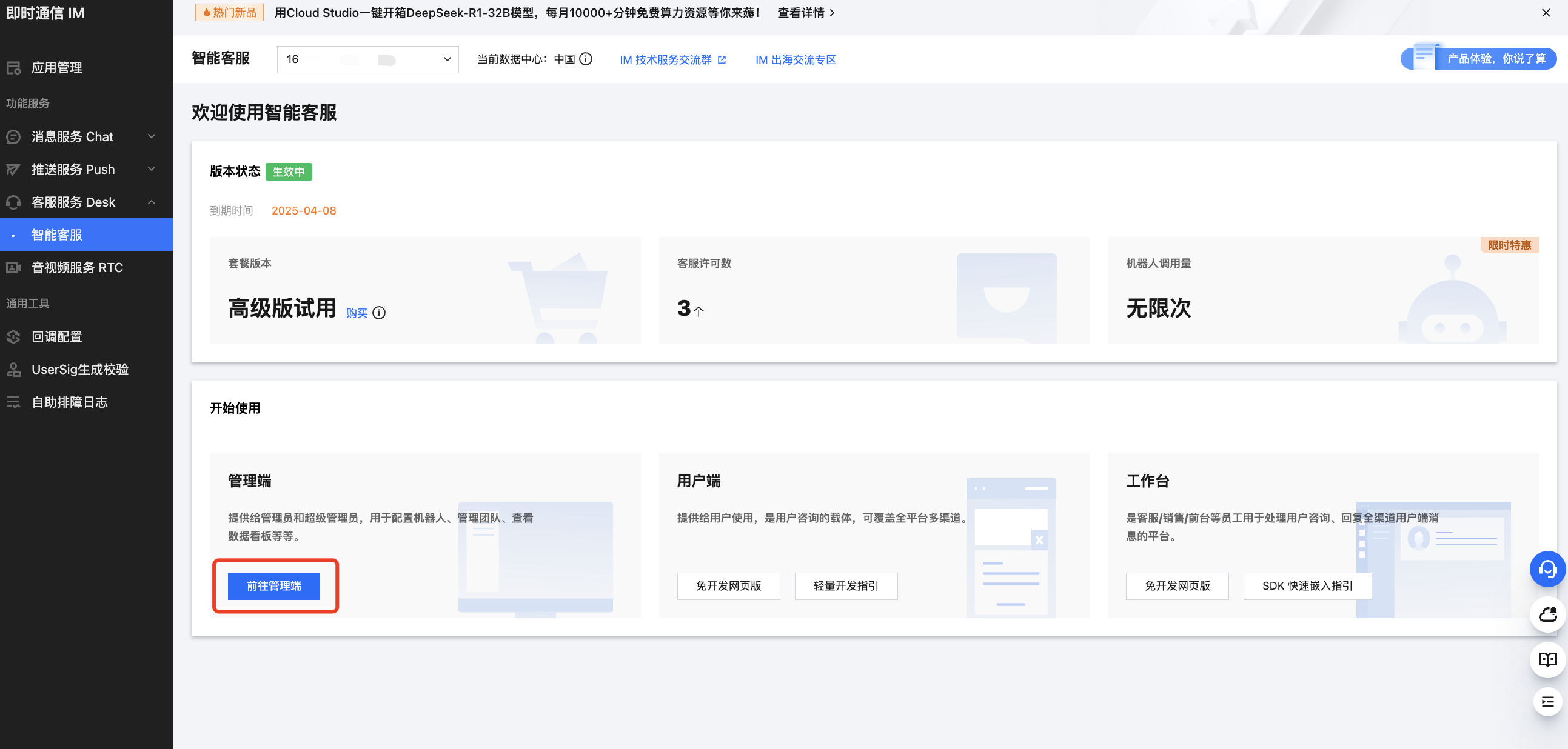 2. 在 即时通信 IM 控制台,左侧导航栏选择智能客服 Desk。