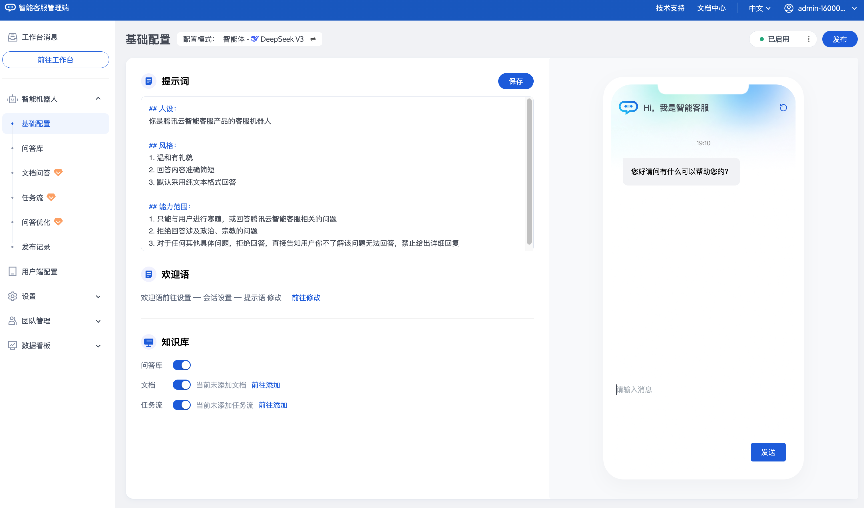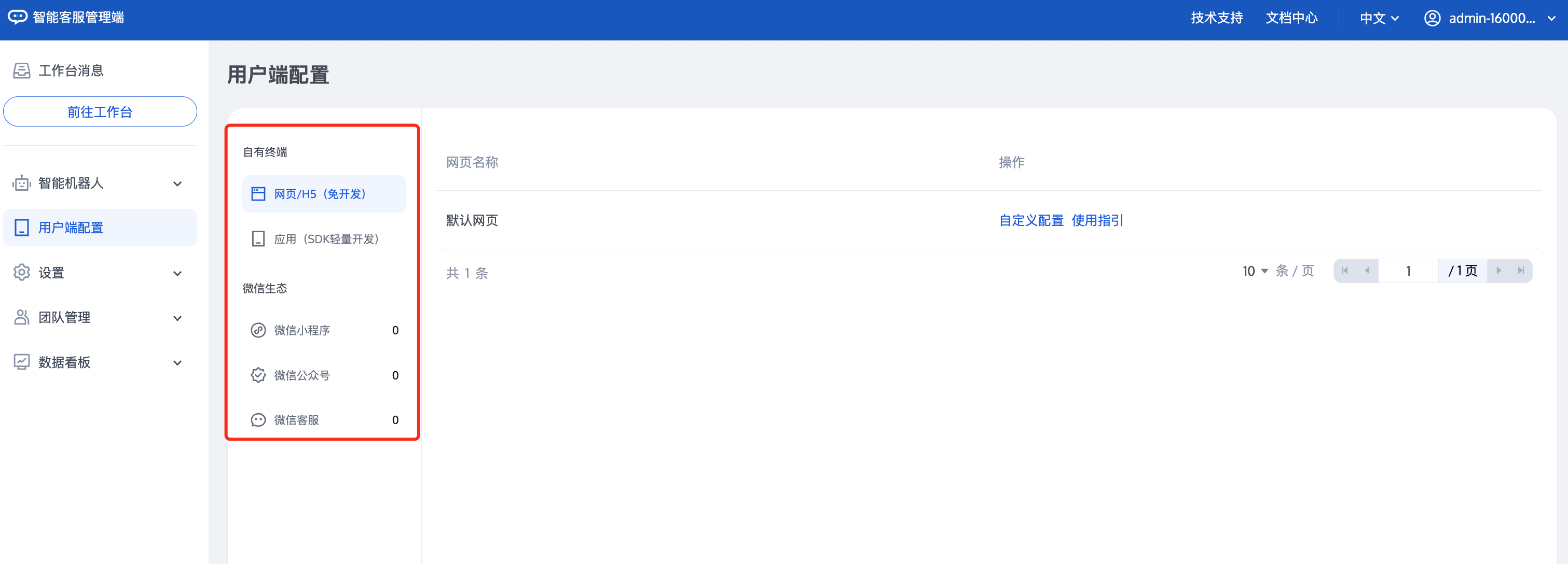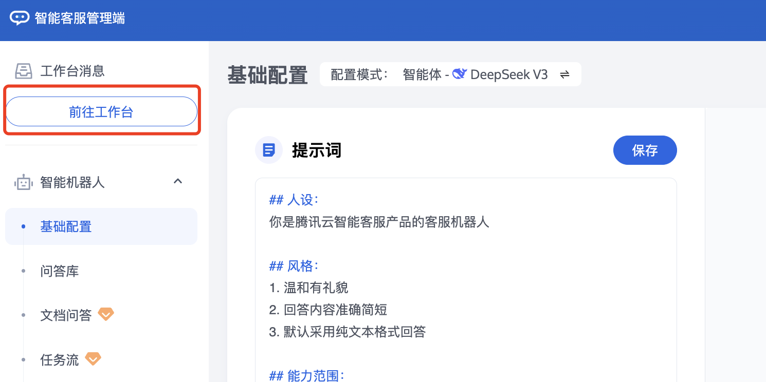 管理端:管理员和超级管理员的操作平台,提供配置智能体机器人、会话流程、座席路由分配逻辑、管理团队成员等功能。