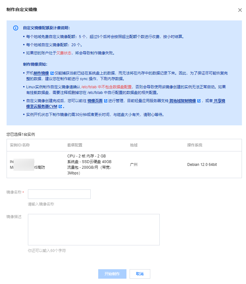 2. 在制作自定义镜像页面,选择自定义镜像 A,输入镜像名称、镜像描述,并单击开始制作。