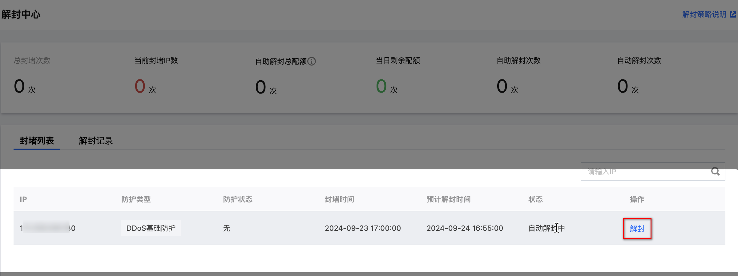 3. 前往 DDoS 防护控制台的 解封中心页面,在封堵列表中,单击目录 IP 操作列的解封。