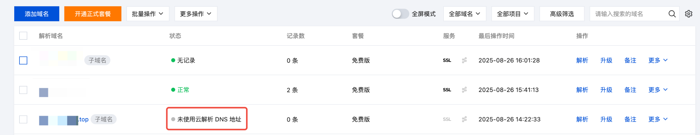 2. 在权威解析页面中,单击目标子域名名称,如下图所示: