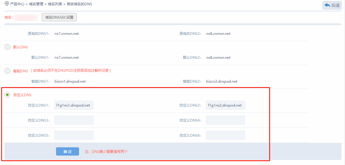 4. 在修改域名的 DNS 页面中,选择自定义 DNS,输入 DNSPod 提供的 DNS 服务器地址信息。如下图所示: