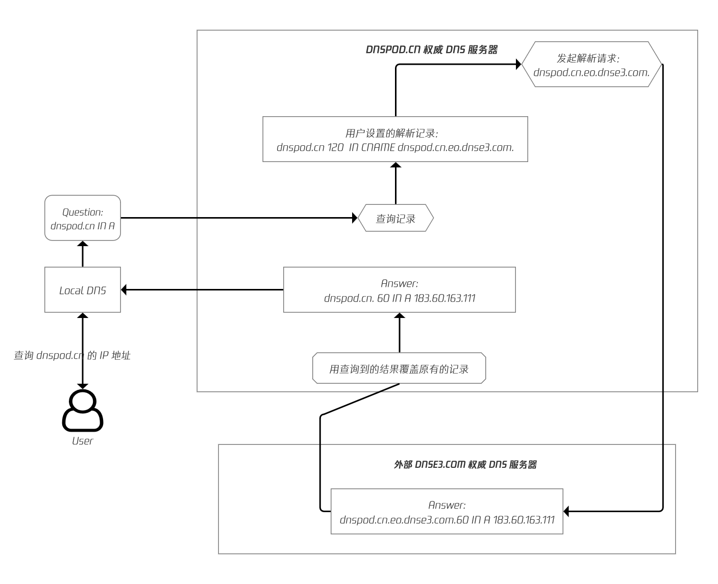 CNAME 展平结果由来自外部 DNS 服务商(如 DNSE3.COM 解析服务商)的 IP 地址组成,其 TTL 对应于外部记录和 DNSPod 所设置的 CNAME记录之间的较低值。