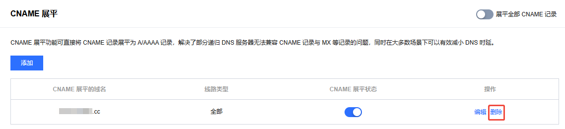 如果您需删除 CNAME 展平,在 CNAME 展平的域名列表中,选择目标域名,单击删除即可。