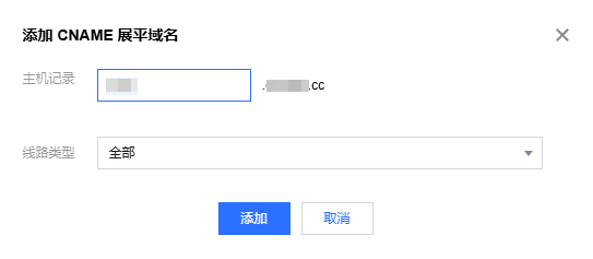 4. 在添加 CNAME 展平域名弹窗中,输入主机记录及选择线路类型,线路类型选择“全部”则会展平该子域名的所有 CNAME 记录,您也可以选择特定线路,例如北京电信,那么只会对该子域名北京线路的用户 DNS 请求开启 CNAME 展平,选择后,单击添加。