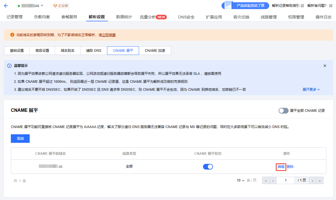 1. 在 CNAME 展平的域名列表中,选择目标域名,单击编辑。