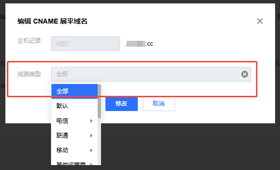 2. 在编辑 CNAME 展平域名弹窗中,可切换线路类型。单击修改,即可完成编辑。