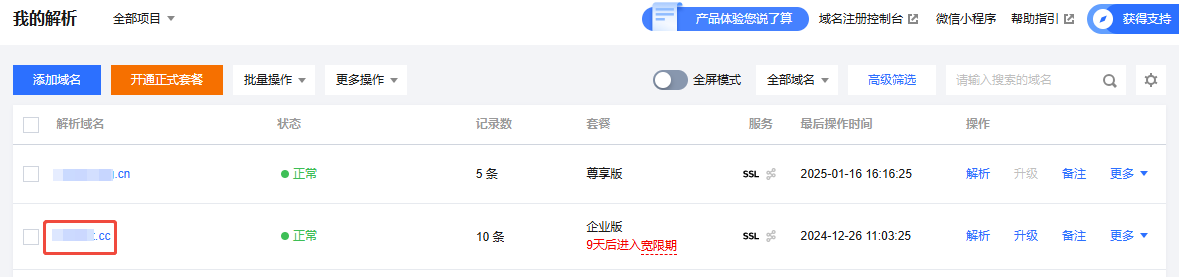 2. 在我的解析页面中,单击域名名称,进入记录管理页面。如下图所示: