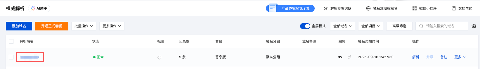 2. 找到需设置的解析域名,并单击解析设置。如下图所示: