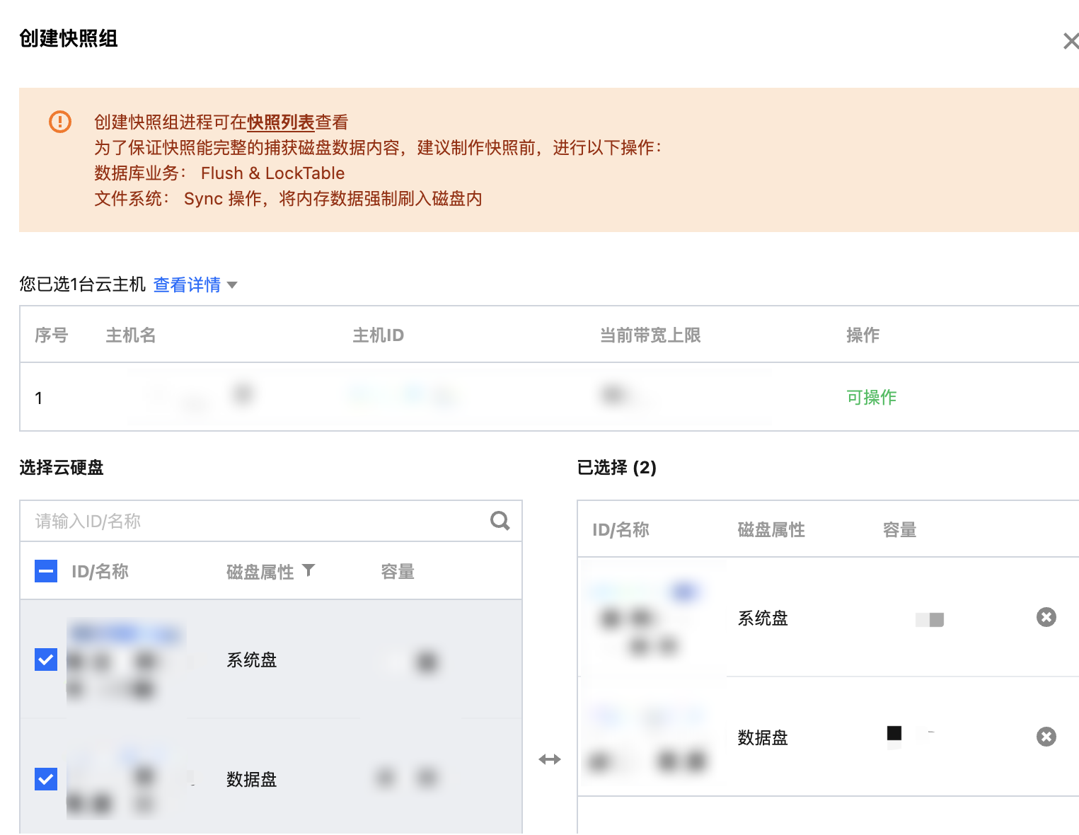 3. 在弹出的创建快照组对话框中,选择需要创建快照的所有云硬盘。