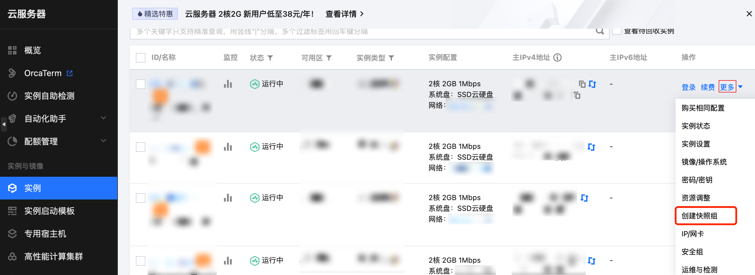 2. 在需要创建快照组的实例所在行选择更多 > 创建快照组。如下图所示:
