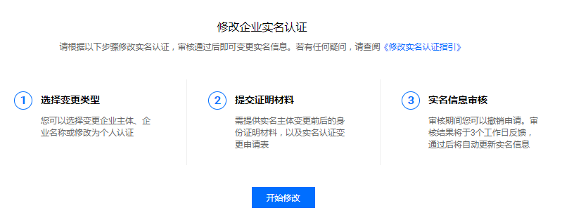 1. 前往修改实名认证页面,在您已完成企业实名认证栏中,单击修改认证主体。