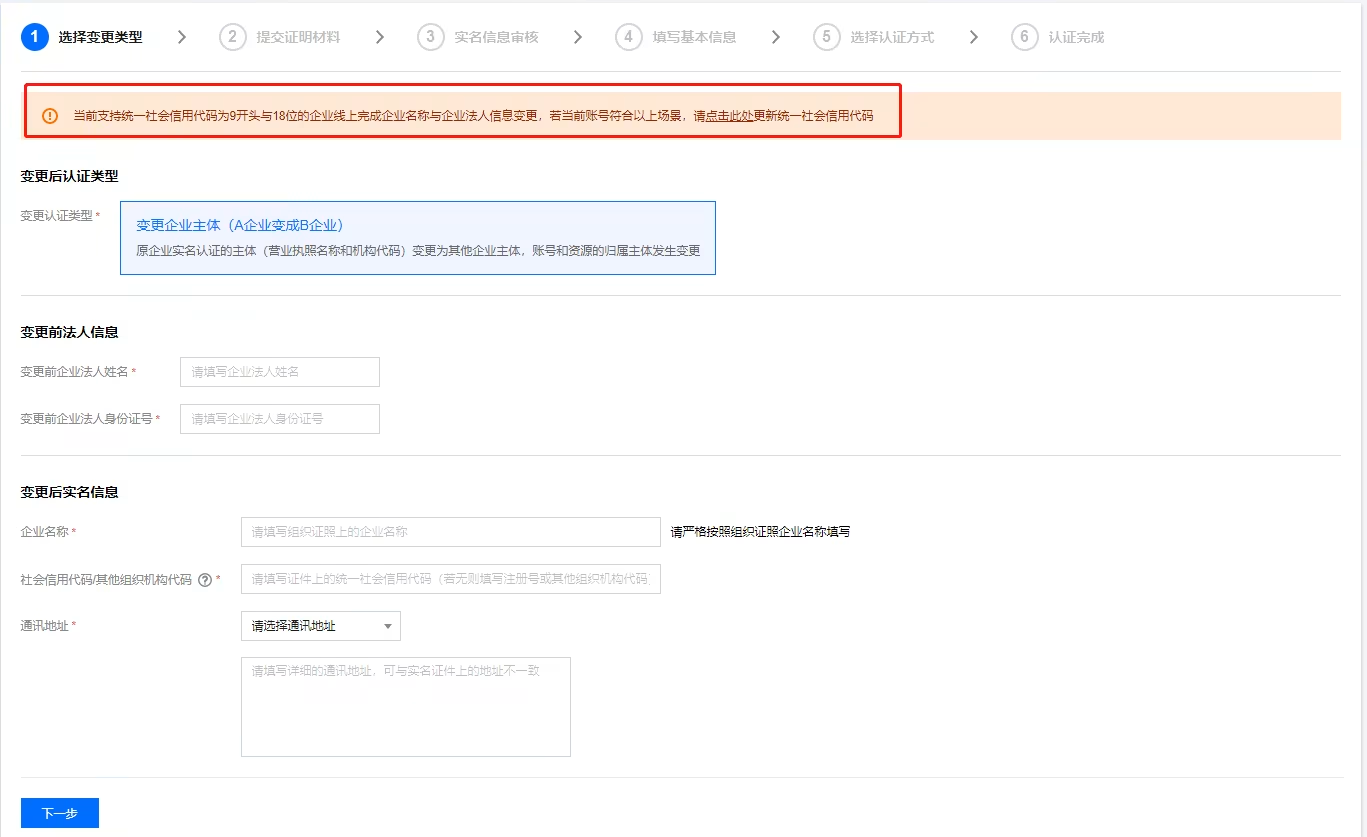 3. 在选择变更类型页面,若该账号的统一社会信用代码不正确,您可以单击点击此处。