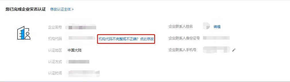 1. 登录腾讯云,前往 实名认证 页面,单击机构代码不完整或不正确?点此修改。