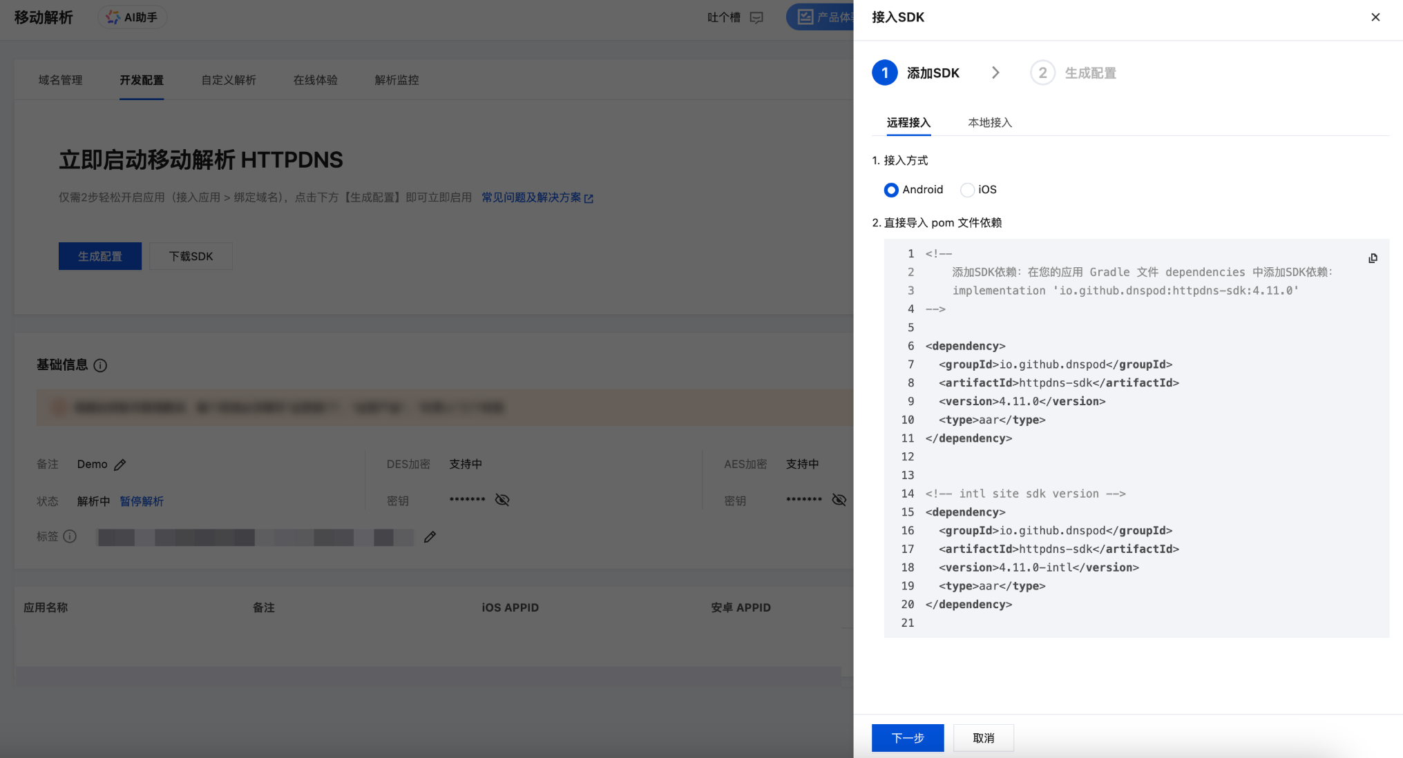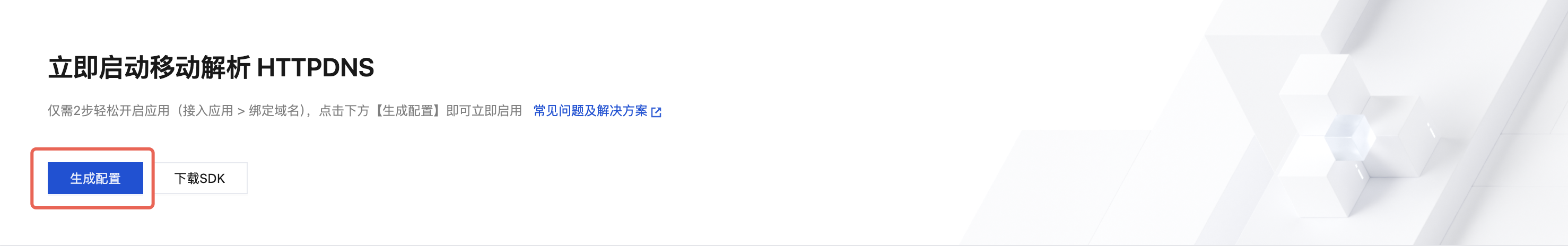 1. 登录 HTTPDNS 控制台 > 开发配置页面,在开发配置页面,单击生成配置。如下图所示: