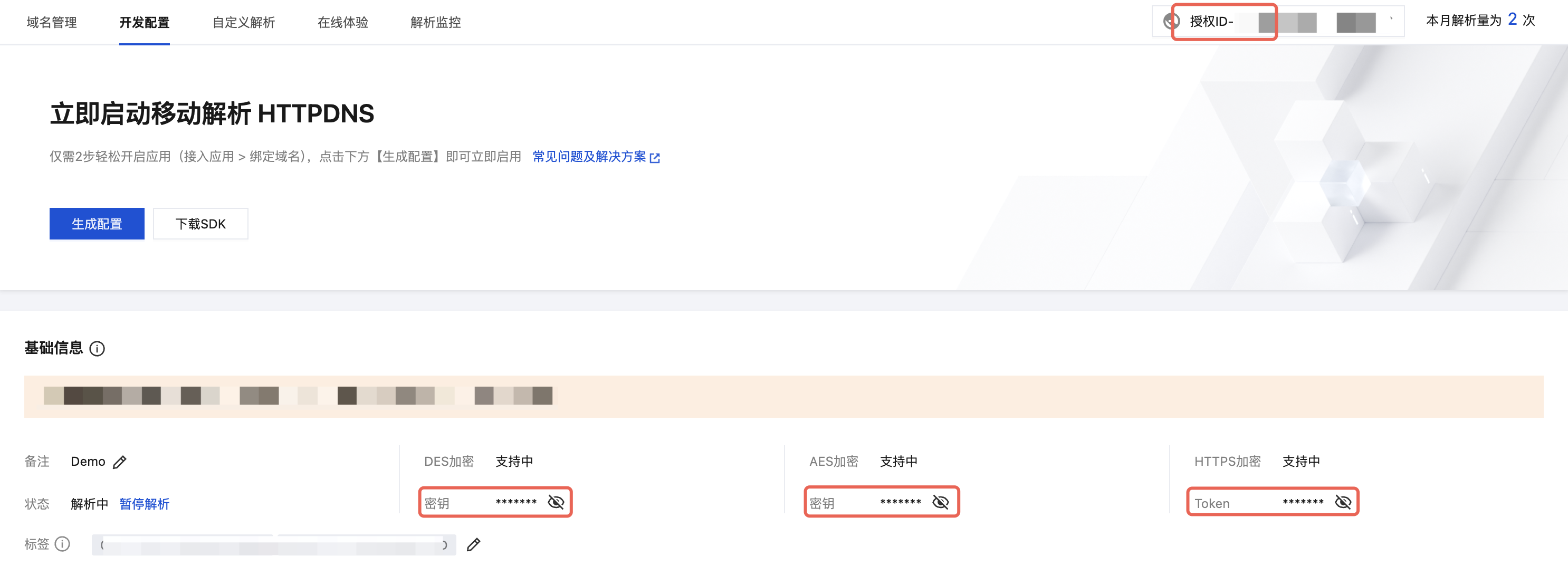 4. SDK 开通后,移动解析 HTTPDNS 将为您分配授权 ID、AES 和 DES 加密密钥及 HTTPS Token 等配置信息。您可前往 开发配置 页面查看,如下图所示: