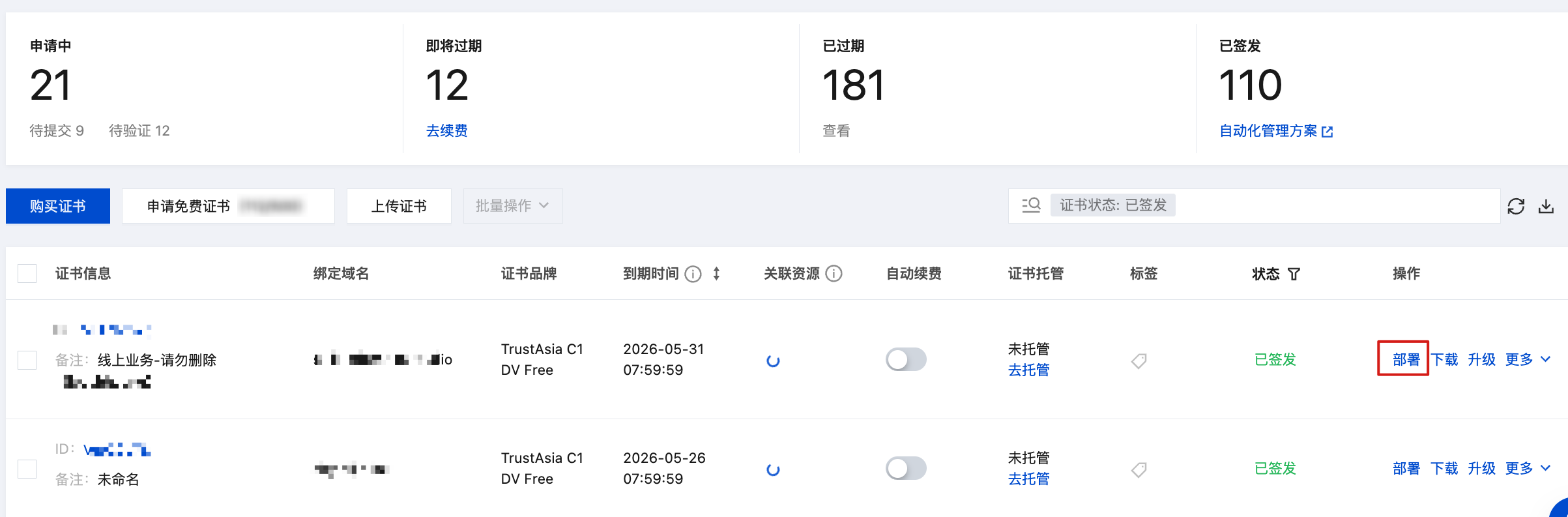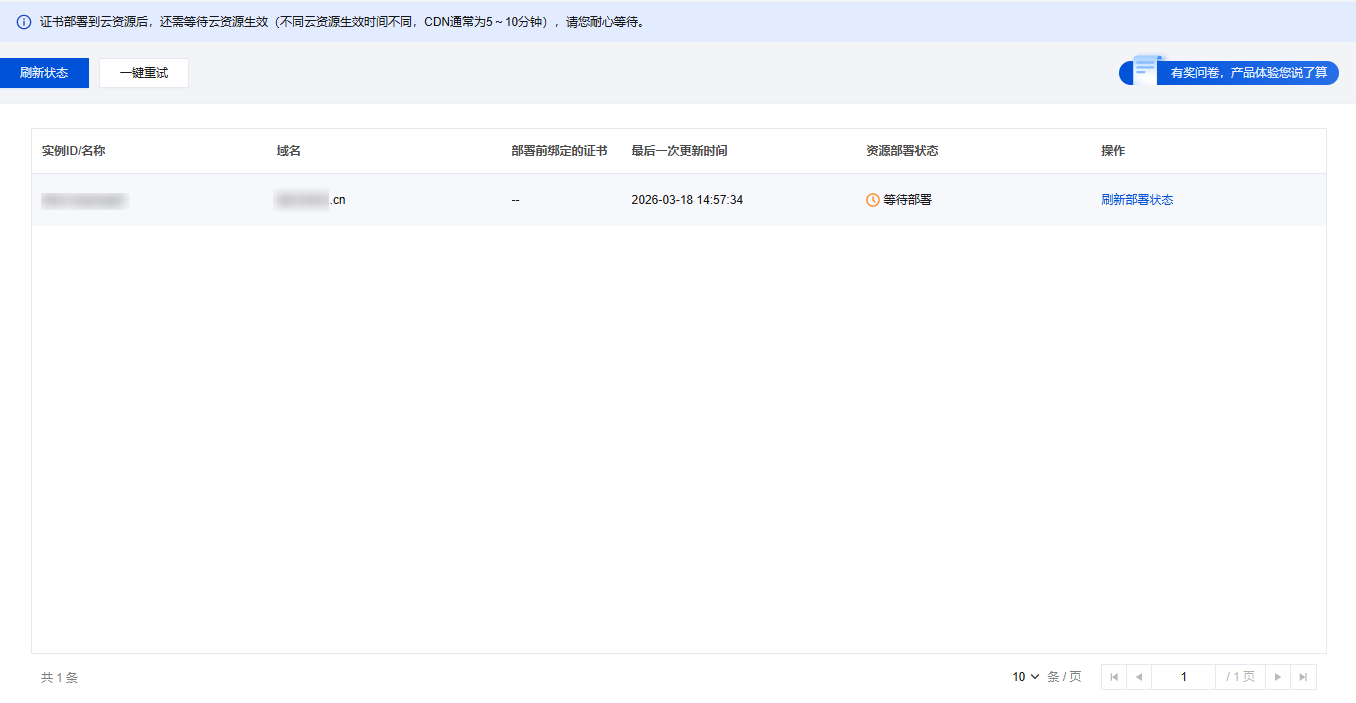 页签,选择您需要部署的证书,并单击