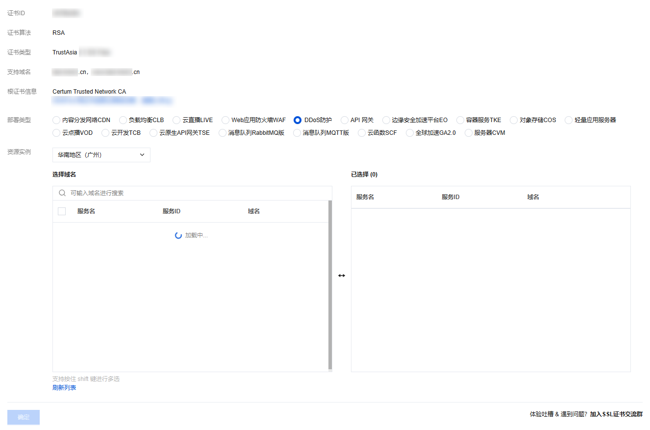如果证书需部署至 DDoS 防护,请您先在