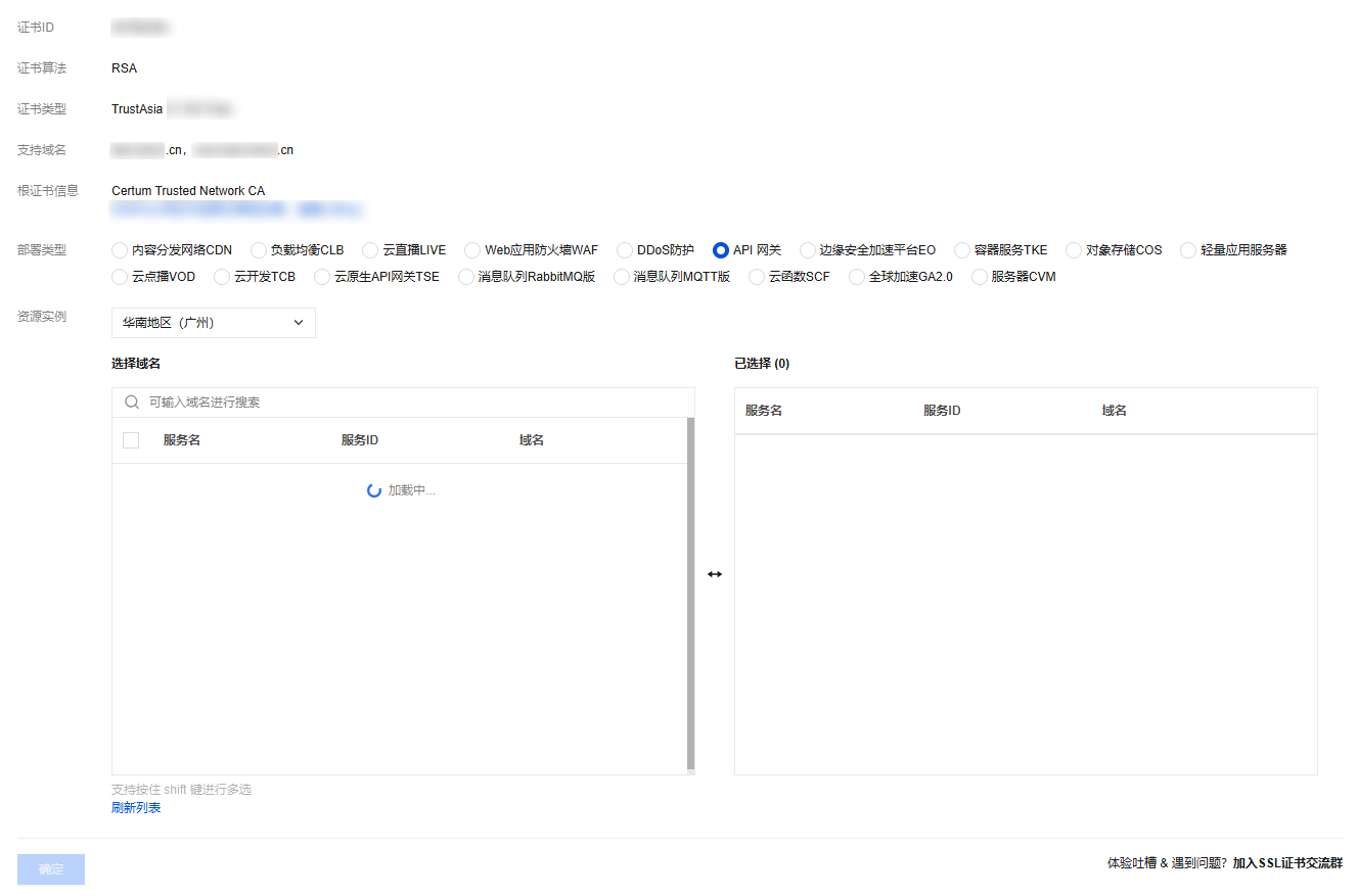 页面,选择您需要部署的证书,并单击