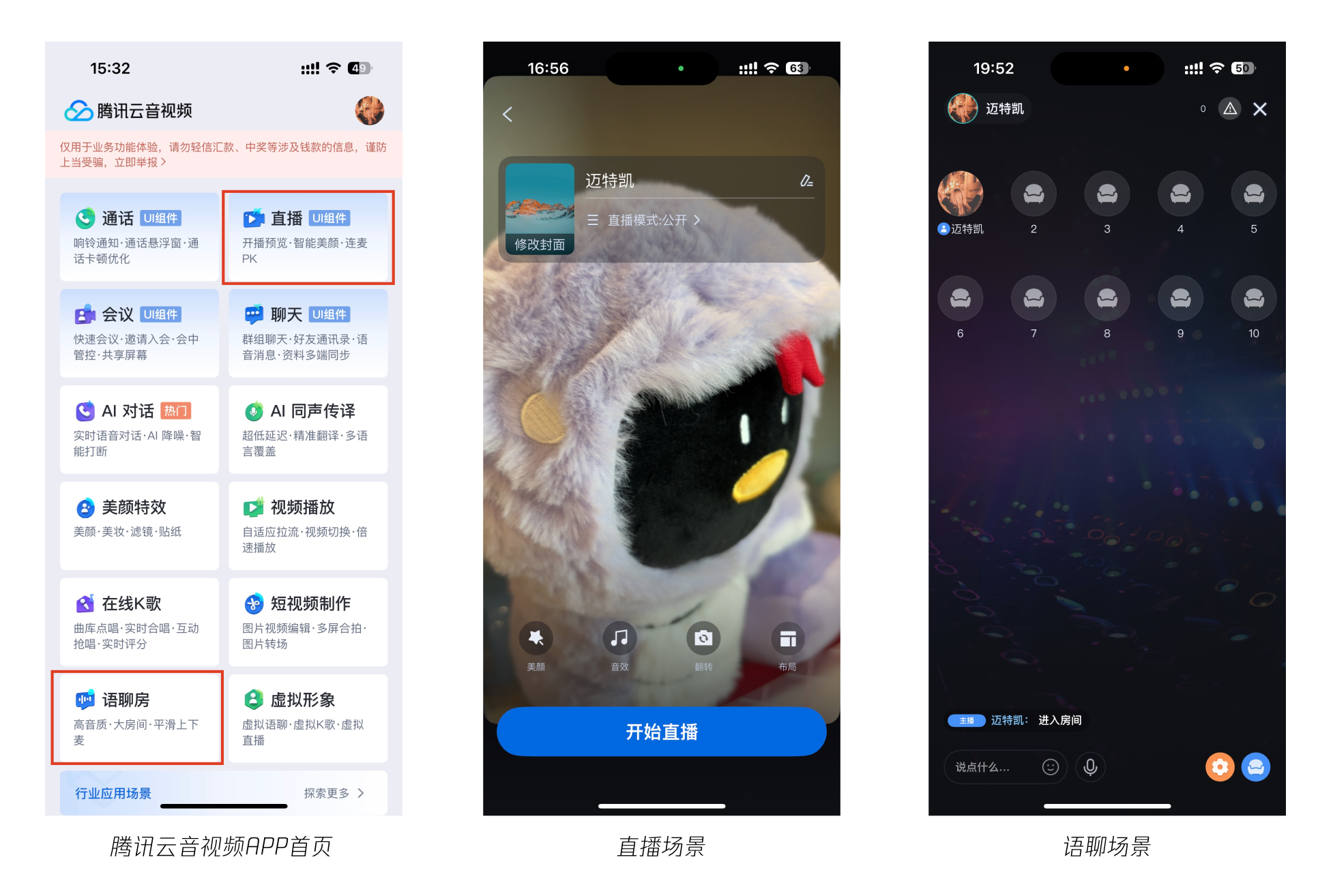 选择语聊房即可体验主播开播、音效设置、语聊房背景切换等语聊功能。