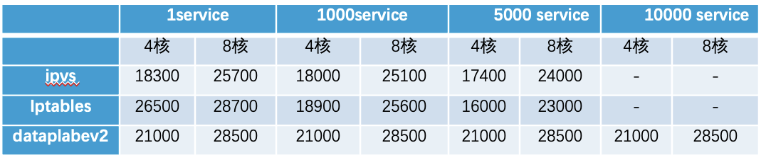 iptables 方案下,转发性能随着 Service 数量的增加而下降;Dataplane V2 的转发性能与 Service 数量基本无关联。