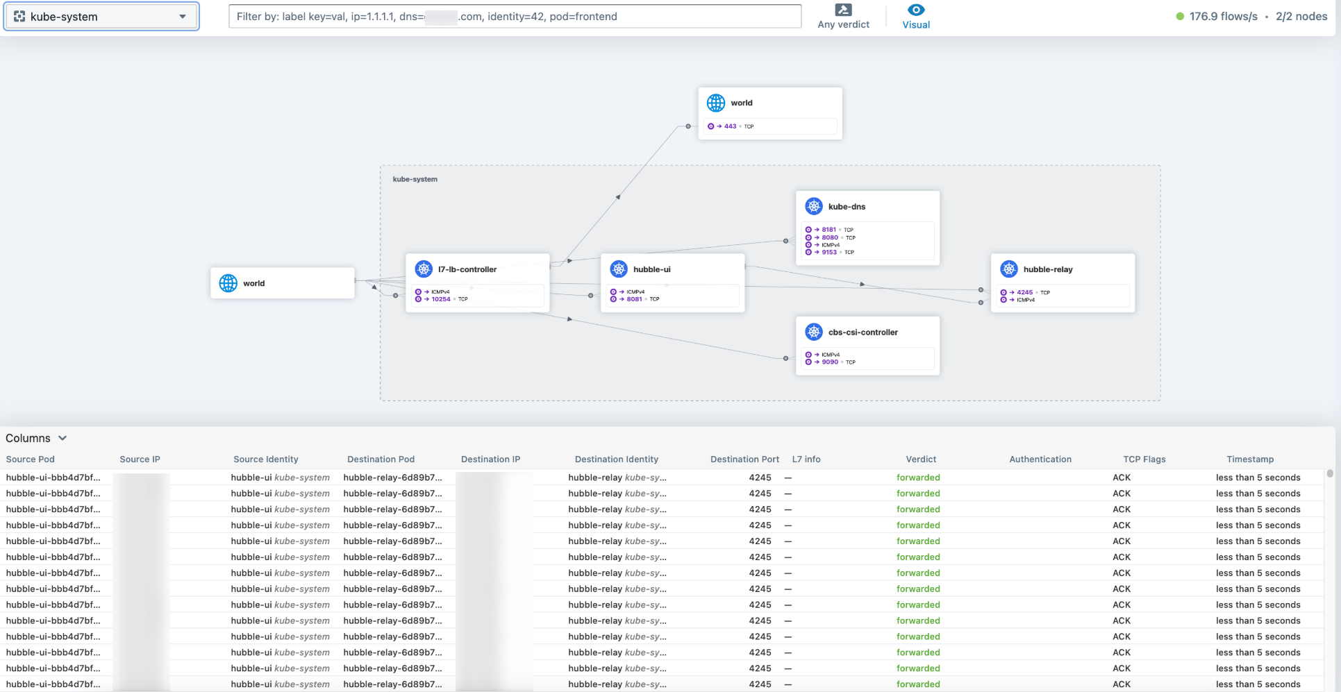 控制面:在 Service 变更频繁或后端变更频繁的场景下,kube-proxy IPVS 模式下的 kube-proxy 进程会长时间占用超过一个 CPU 核心,时长和受影响的 Service 成正比。例如,500个 Service 受影响时,需要持续大约25秒。而在 Dataplane V2 情况下,基本无明显感知。