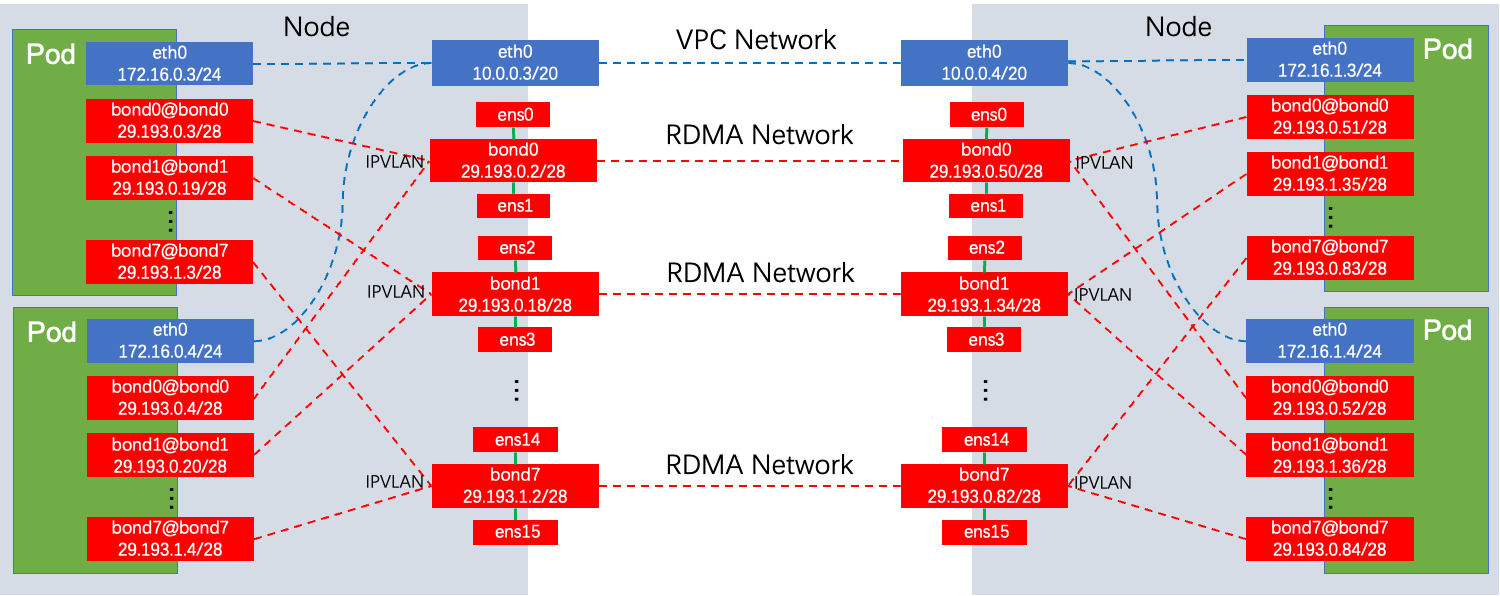 每个 Pod 还分配了 8 个 IPVLAN 虚拟化出的 RDMA Bond 网卡,每个网卡与节点的其中一个 Bond 网卡对应,且有独立的 IP 地址,可访问 RDMA 互联网络。