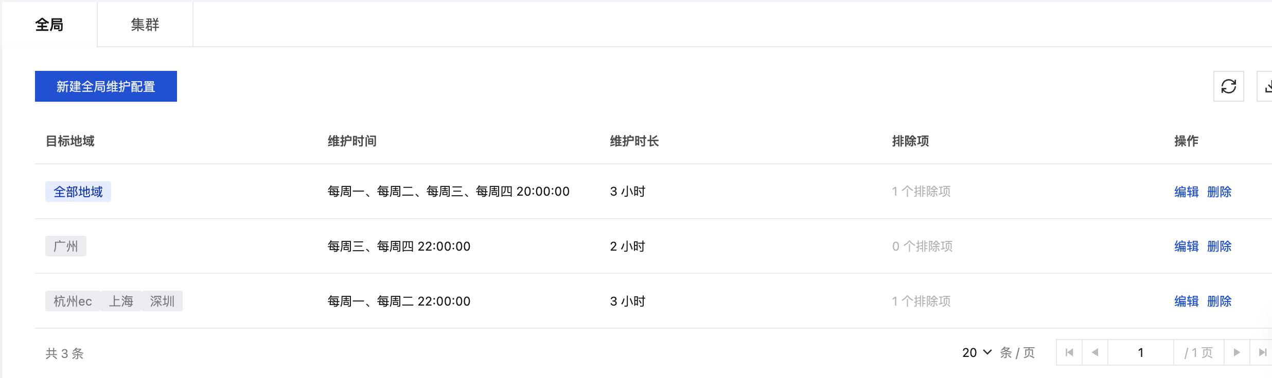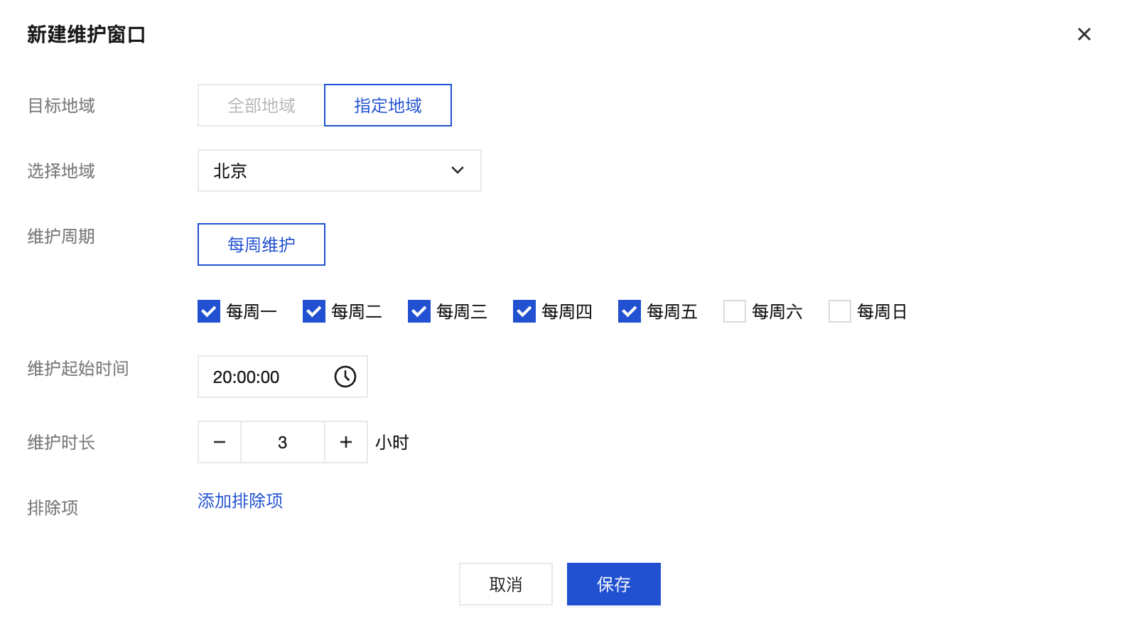 目标地域:全部地域或指定地域。若选择指定地域,每个地域只能存在于一条全局维护窗口配置中。