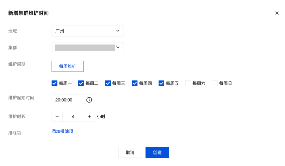 维护周期:用户需要指定集群每周的维护日期(如周一至周五),至少需要指定一个维护日期。