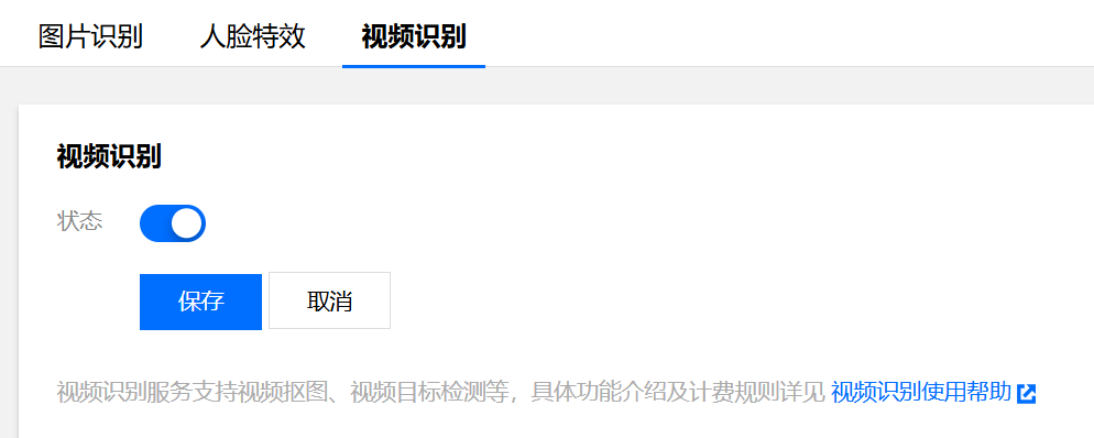 视频识别:单击编辑将状态修改为“开启”,单击保存,即可使用。