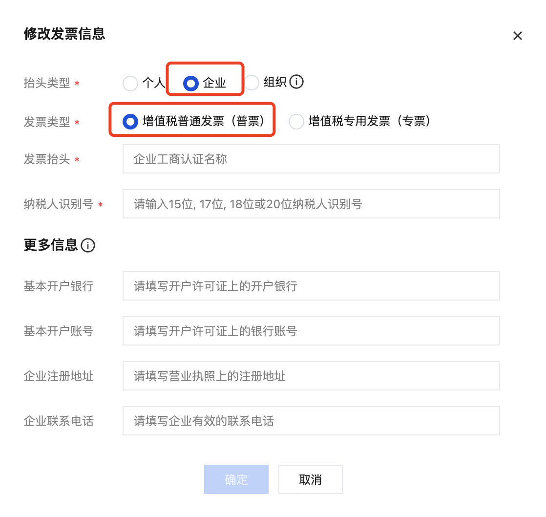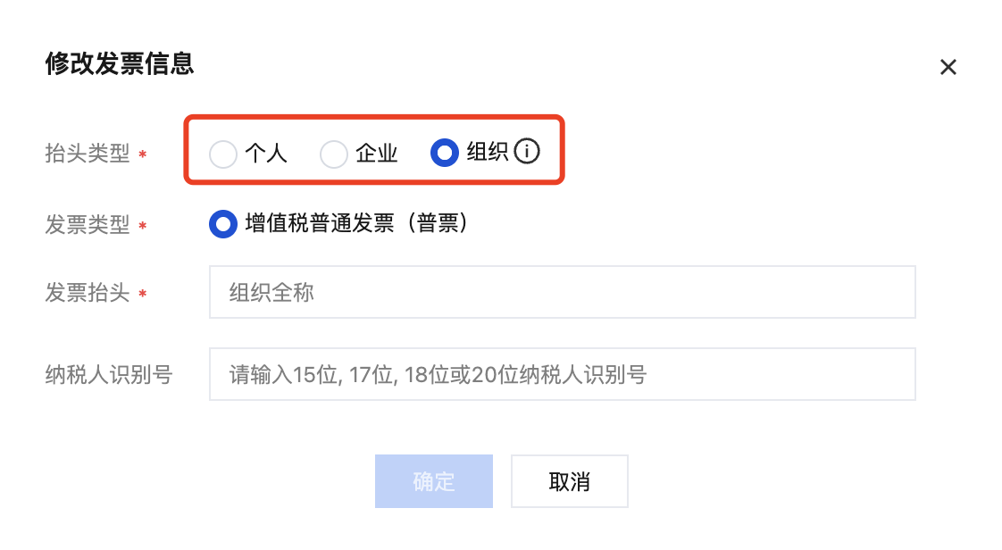 发票抬头 | 发票抬头与账号认证主体有关。 个人认证账号,默认为“个人”,不支持修改为姓名,如需开企业发票请先完成 企业实名认证。 企业认证账号,默认为“认证的公司名称”,如需开其他公司抬头,请 变更实名认证。 学校/政府/公共事业/非营利性机构等组织,可选择抬头类型为组织。 |