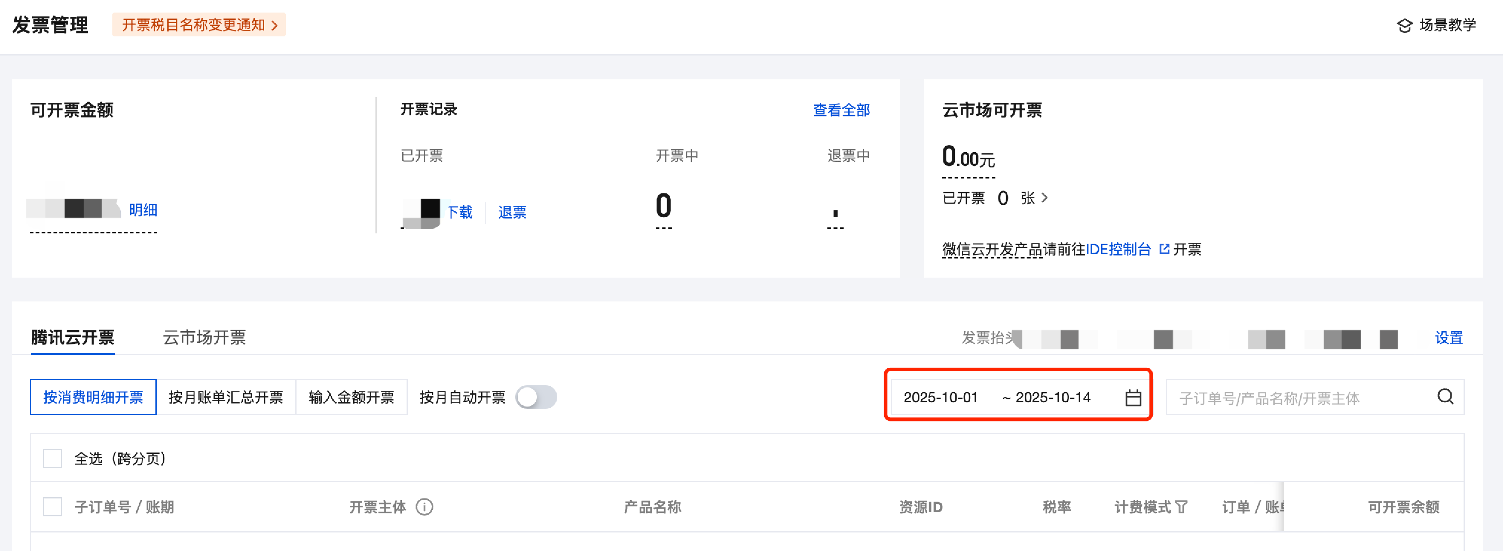 可开票金额 = 腾讯云现金消费金额 - 已开票金额。
