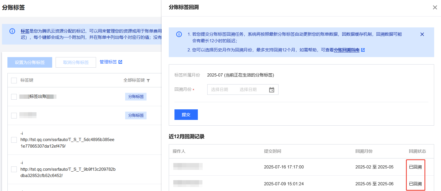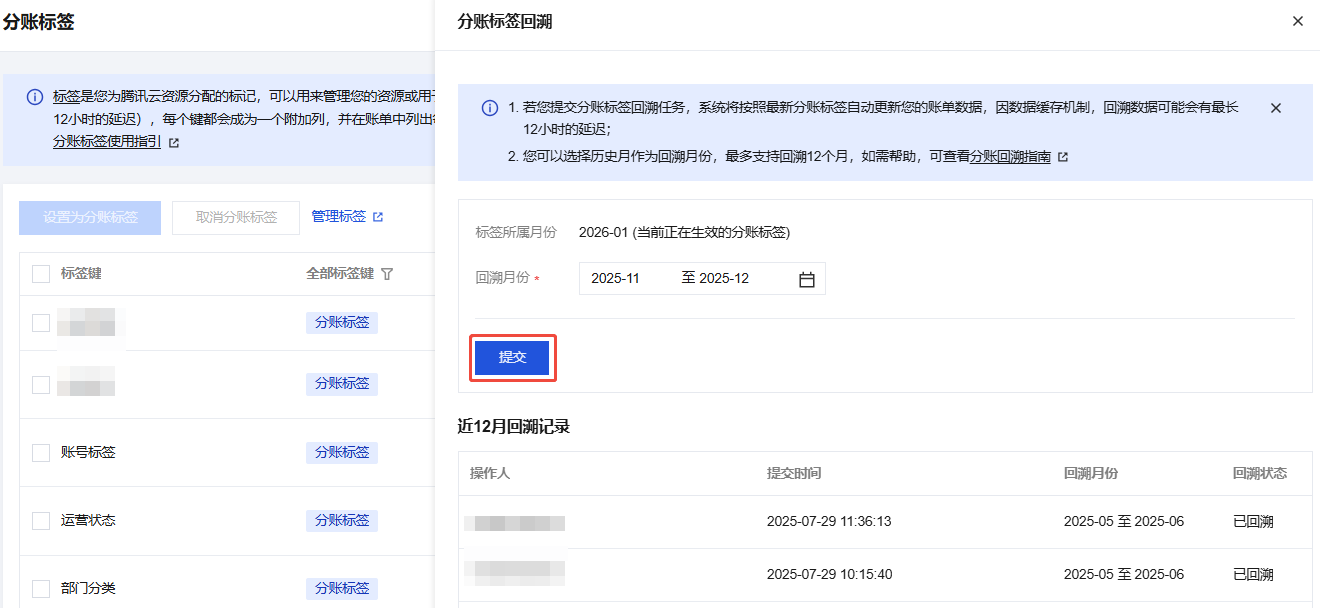 分账标签回溯能力是以当前设置为分账标签的标签键和资源与标签的绑定关系重刷历史月分账账单,最长支持回溯12个月的分账标签。