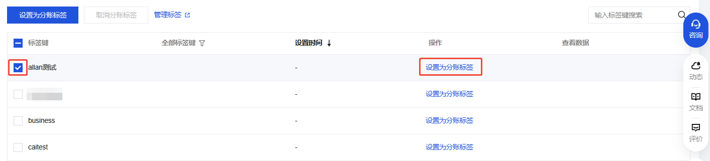3. 在分账标签页面,勾选需要操作的标签键,单击设置为分账标签。