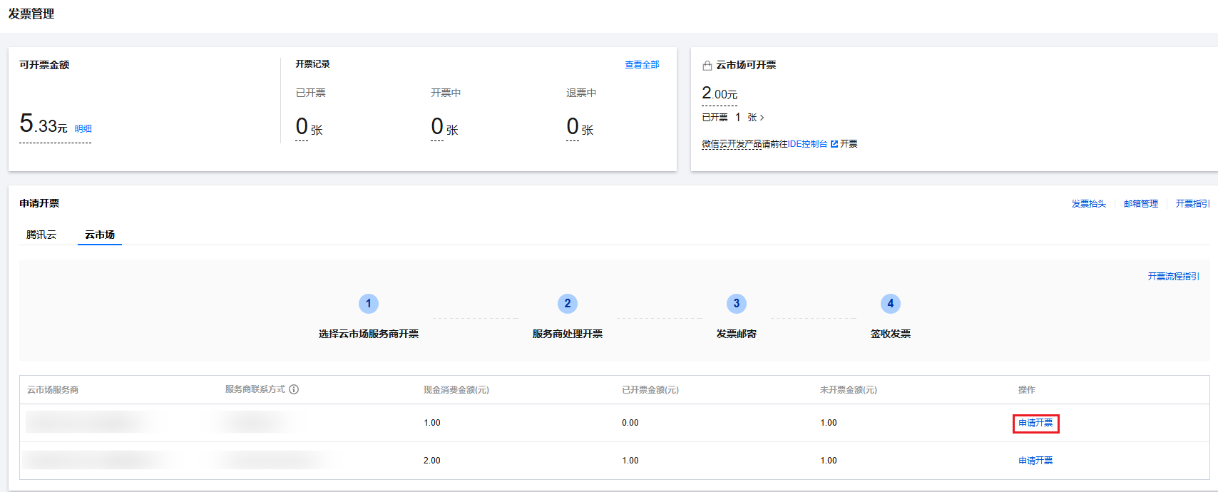 2. 选择需要开票的云市场服务商,单击申请开票。