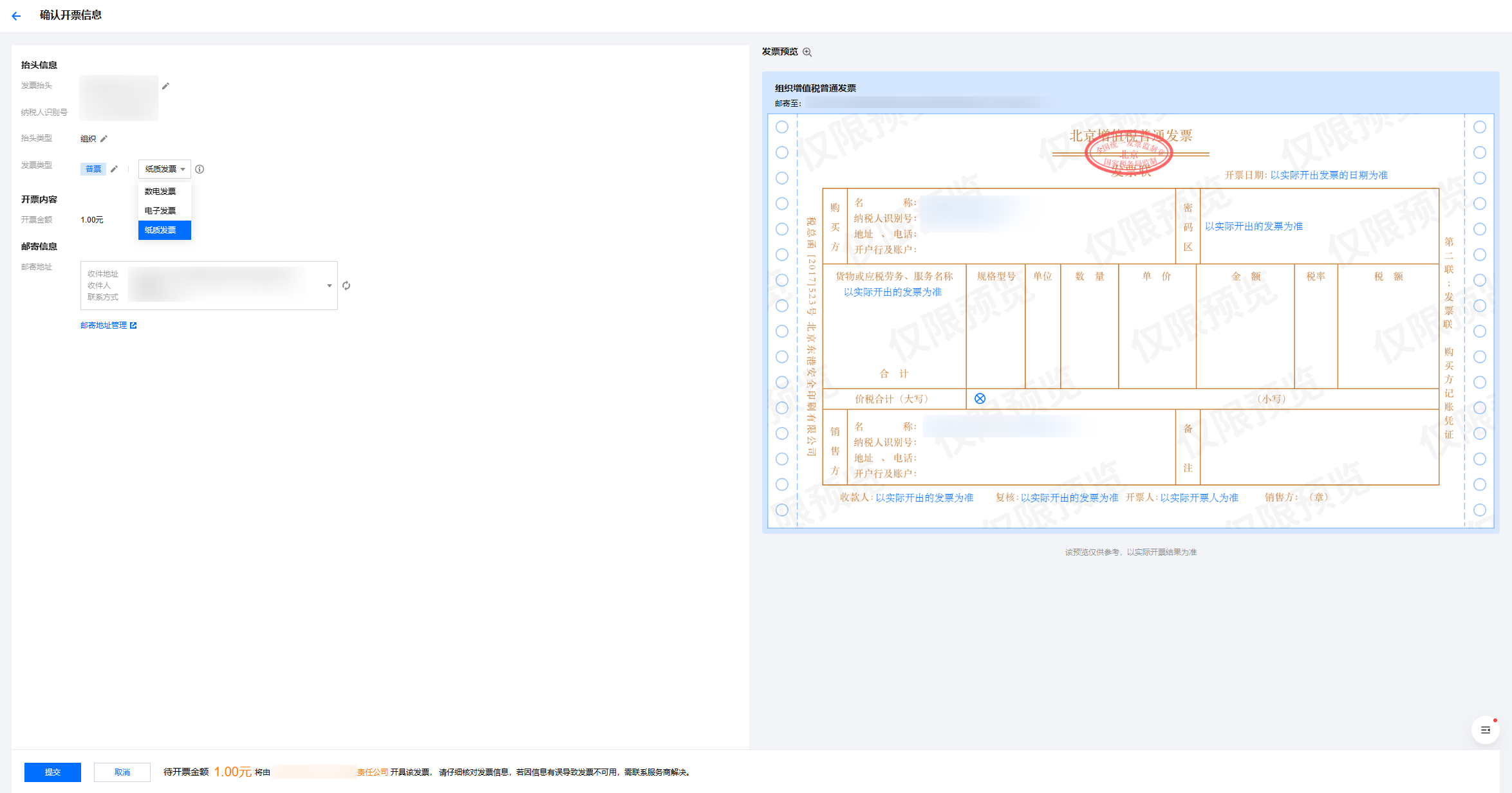 4. 在确认开票信息页面,添加或修改发票抬头信息、选择发票类型。如选择纸质发票,则需添加或选择邮寄地址。