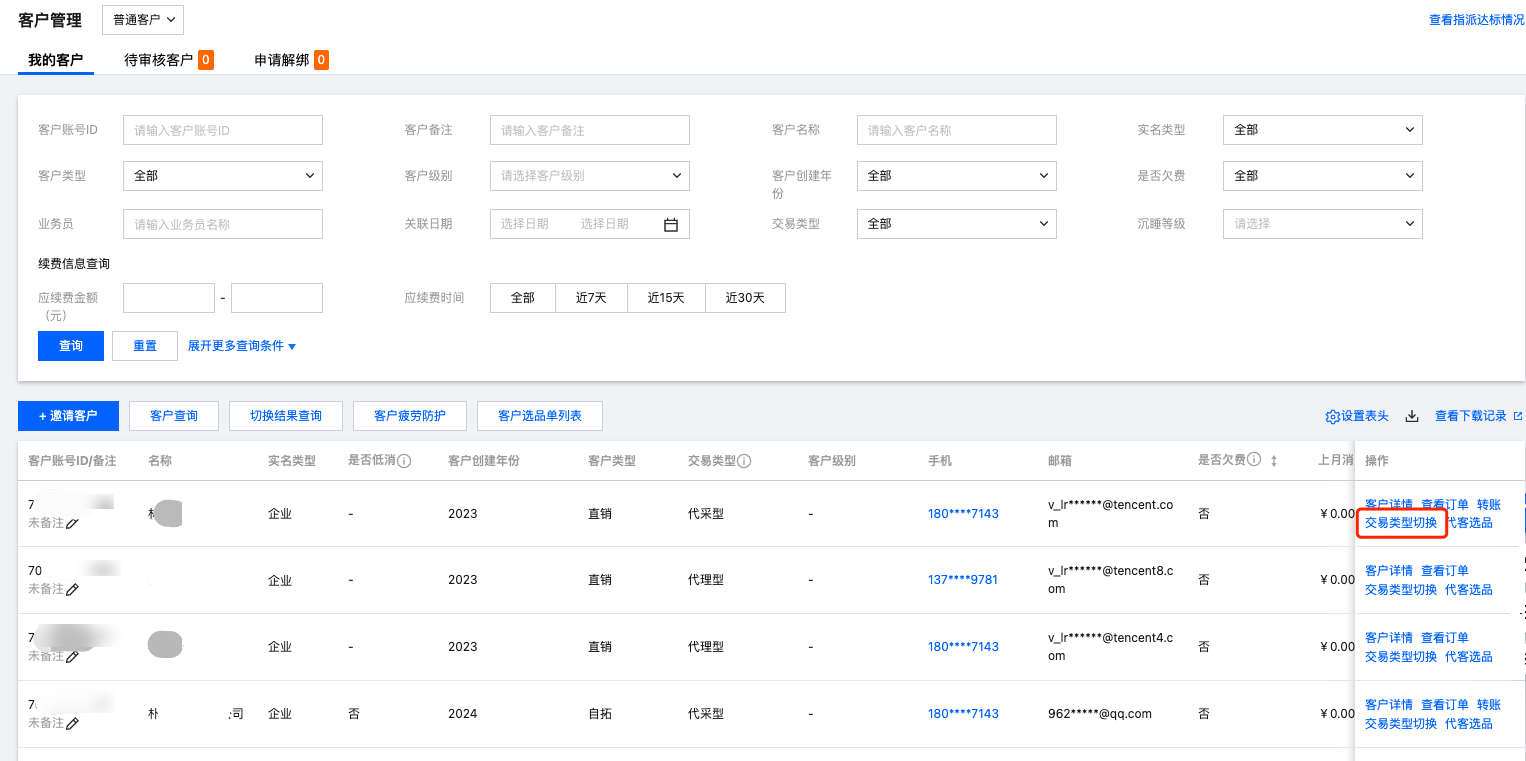 2. 在客户列表页下找到需要切换的客户,单击交易类型切换。
