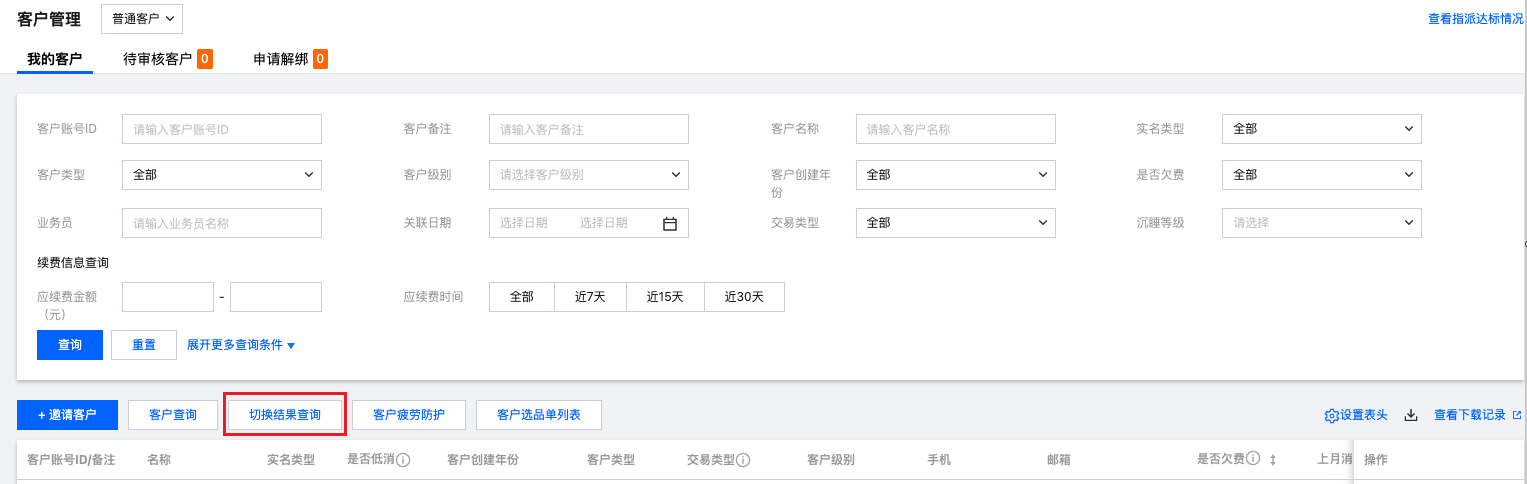 2. 在列表页单击切换结果查询,进入“交易类型切换列表”页查看及关注客户切换的进度。