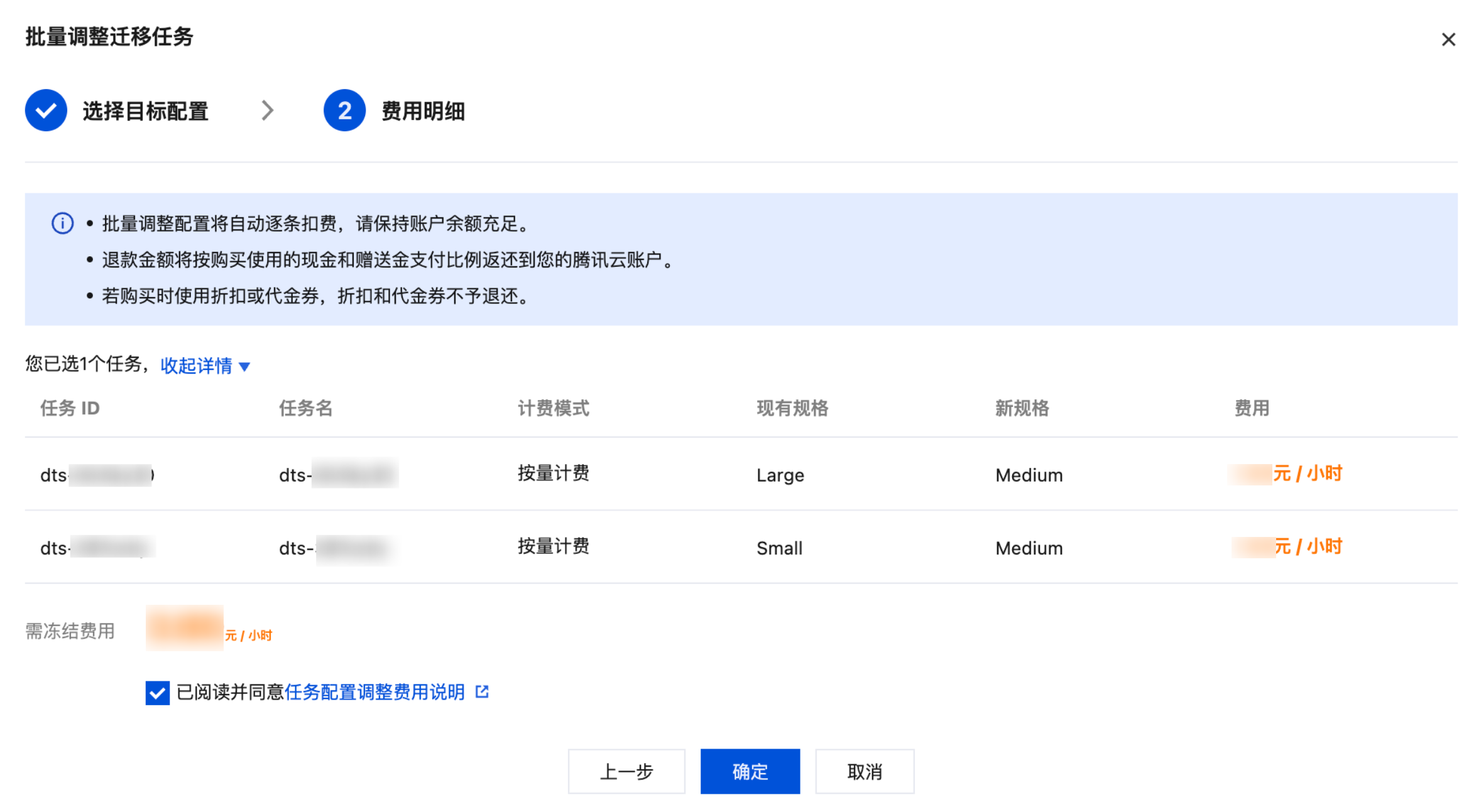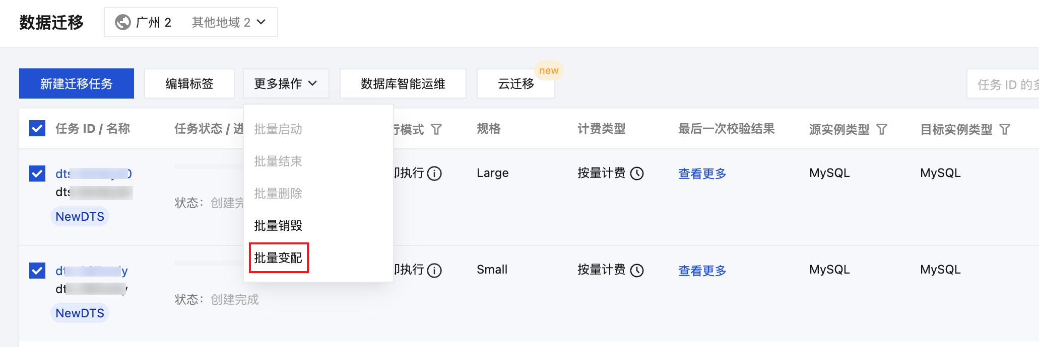 1. 登录 DTS 控制台,在左侧导航选择数据迁移页,批量选择指定任务,在页面上选择更多操作 > 批量变配。