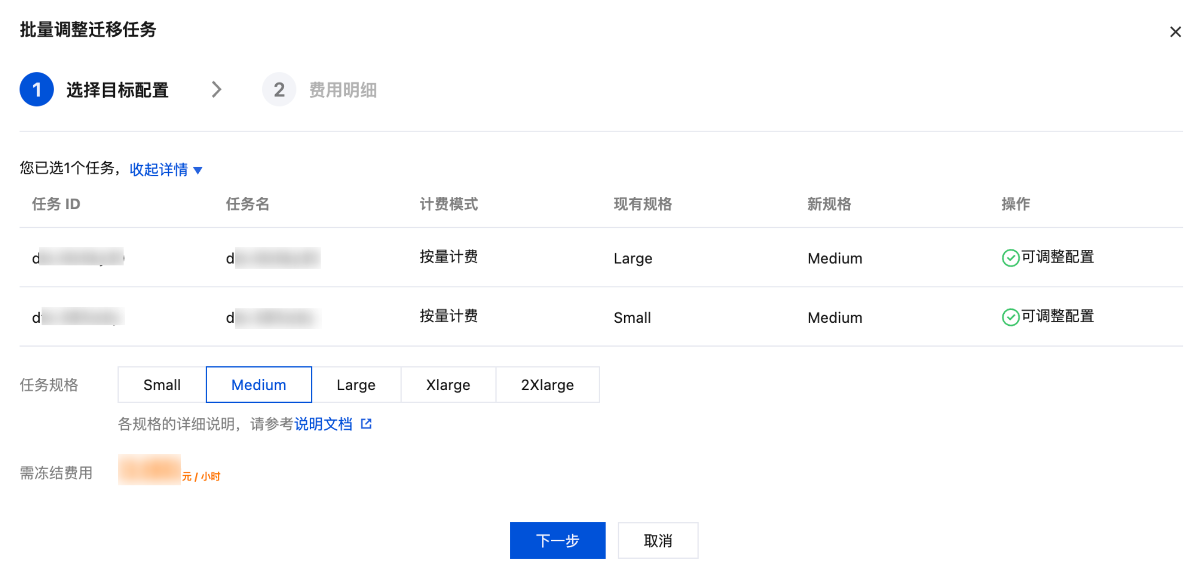 2. 在选择目标配置对话框中,选择需要变配的任务规格,单击下一步。