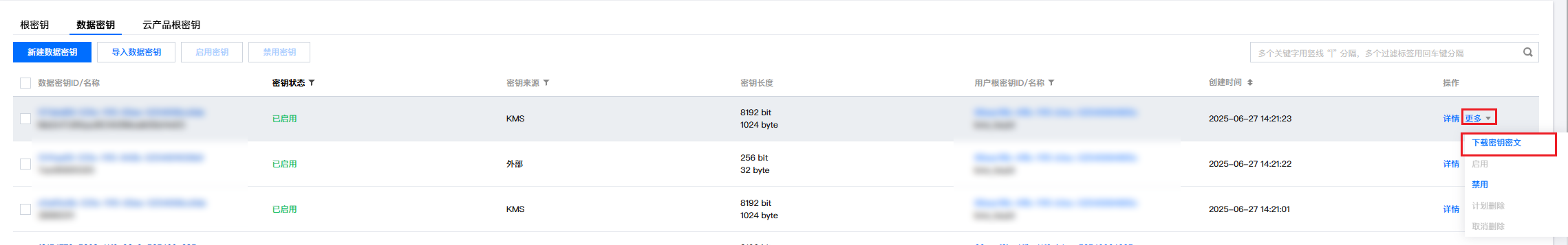 在数据密钥管理页,选择您需要下载的密钥,单击操作栏中的