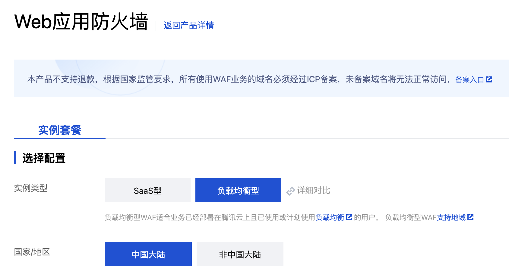 3. 在 Web 应用防火墙购买页,选择“负载均衡型实例”。如下图所示: