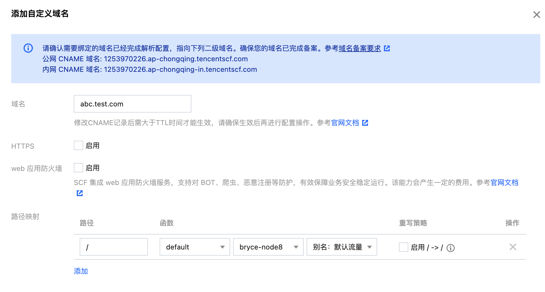 ,在 DNS 服务商处添加解析记录解析到该域名,并在函数平台配置路径映射到指定的函数。当您的用户访问您的自定义域名 test.com