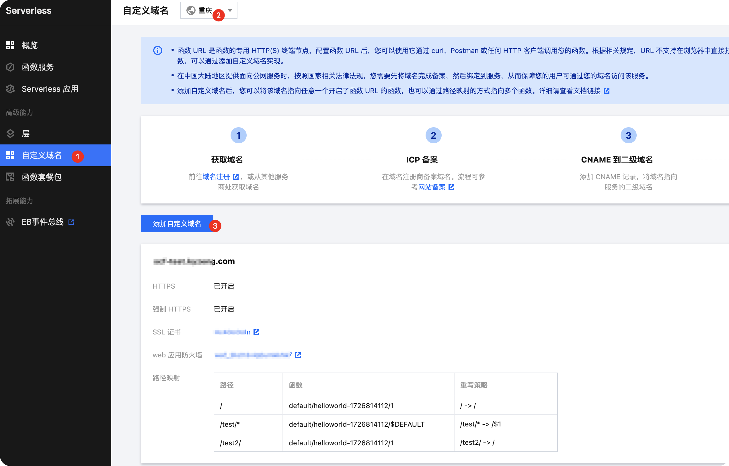函数平台现已支持“自定义域名”功能,允许用户通过浏览器或其他终端访问您的函数。